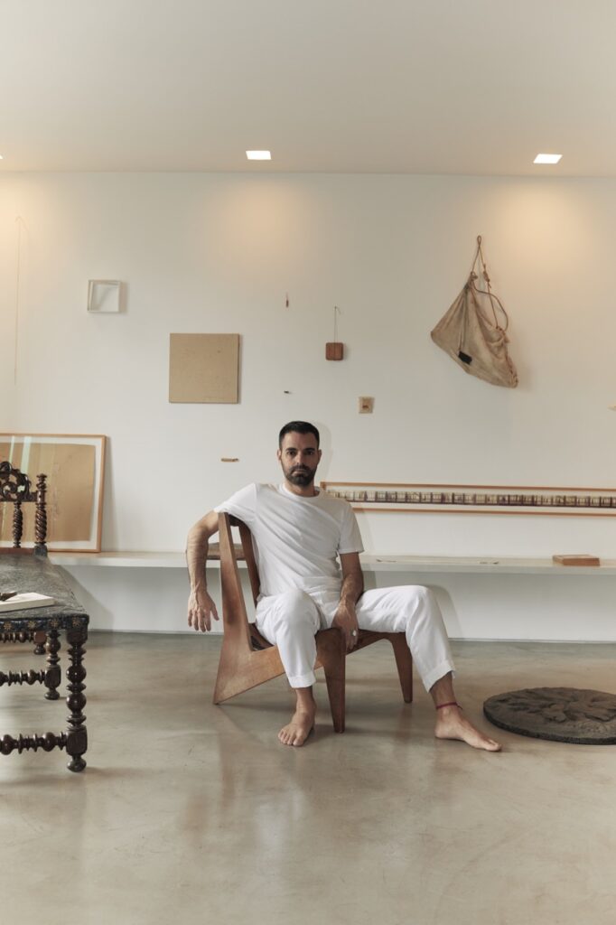 O apartamento de Rafael Moraes se debruça sobre a Avenida Paulista, seus prédios e seus fluxos. Mas as cortinas fechadas e a coleção de arte esparramada por toda parte nos convidam a outra viagem. São Brasis do passado, pequenas Áfricas, a Bahia de Caymmi, terreiros, arte conceitual dos anos 1970, fios de uma coleção que ele monta a partir do que define como “atravessamentos”. Ao entrar ali, já não sabemos bem em que tempo-espaço estamos.