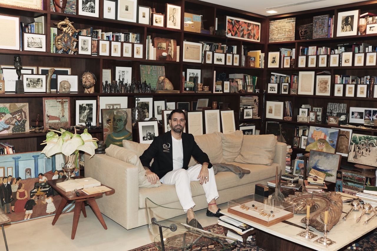 “Aqui é um autorretrato da Lygia Pape, da década de 1970. Eu demorei para comprar uma Lygia Pape, mas quando eu vi isso me apaixonei. Eu amo como ela se sintetiza: uma mecha de cabelo e uma geometria onde se lê EU.” Assim como esta, cada peça tem sua trajetória: de onde veio, a quem pertencia, por que está ali. De minúsculos objetos até o outro apartamento que mantém em Copacabana, no Rio, que um dia foi de Jorge Amado, parece imperar a máxima que ele usa para falar das joias: “Cada balangadã tem uma simbologia, tem uma história.”