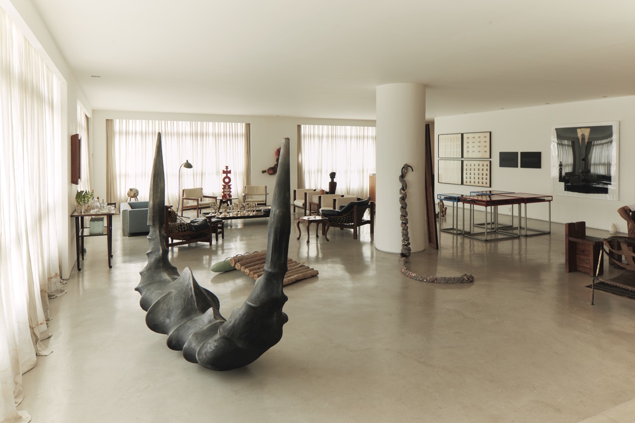 Uma escultura de grandes dimensões de Angelo Venosa divide espaço com os móveis, eles também marcados pela brasilidade autoral: uma cadeira de Flávio de Carvalho, um sofá de Joaquim Tenreiro, um sofá do Willys de Castro (“o único móvel que ele fez, para uma amiga dele, a galerista Mônica Filgueiras”). Algumas obras estão fora, emprestadas para exposições em museus dentro e fora do país.