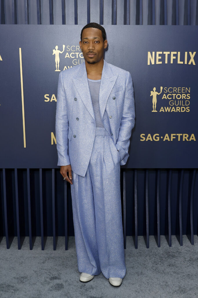 Hoje em dia, um terno folgado e descontraído raramente é má ideia. Isso normalmente inclui uma calça wide leg no conjunto, e quando você adiciona um blazer combinando — seja mais ajustado, como o de Tyler James Williams, ou mais solto, como o de Robert Pattinson — o efeito é de um visual coeso e coordenado. Sua calça wide leg nunca vai parecer fora de lugar se fizer parte de um conjunto; sempre vai parecer uma escolha intencional.