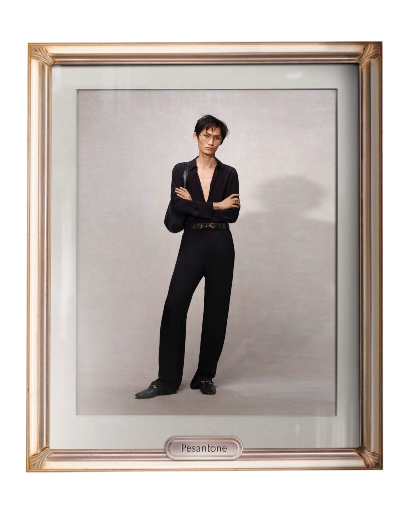 As personas Gucci também representam como os italianos reproduzem os códigos da Casa em sua relação coletiva de “dolce vita” com a moda. No menswear: a elegância do traje de noite é aplicada a conjuntos transparentes ajustados ao corpo e a sofisticados black-tie de moda praia.