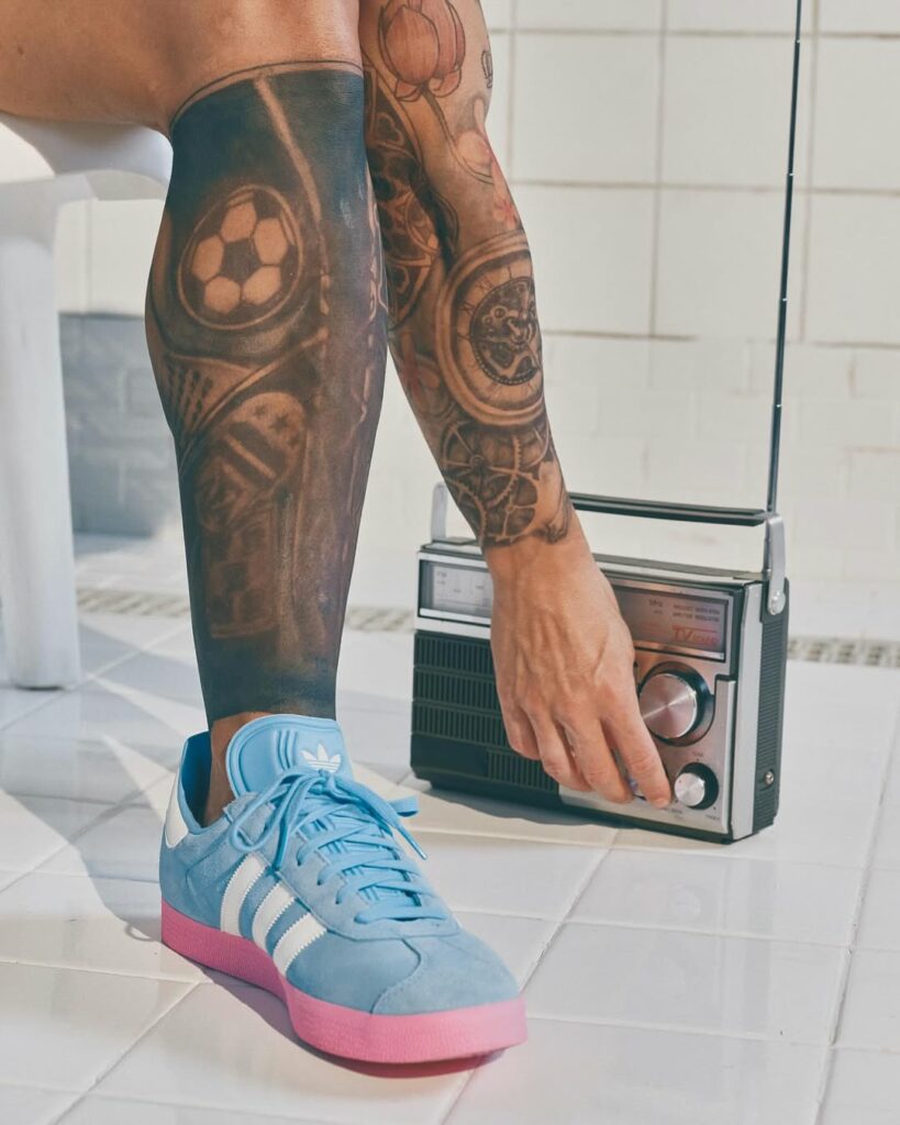 A coleção também inclui jaqueta varsity, tênis Gazelle, camiseta e shorts.