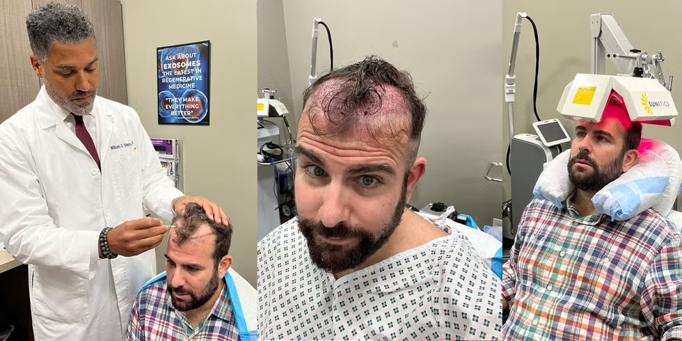 Tudo terminou cerca de seis horas depois. Saí com uma sacola de kits de produtos pós-operatórios com fórmulas próprias do médico, incluindo xampu, condicionador e um spray metabolizador que me foi instruído a usar nos meus enxertos a cada hora durante a primeira semana após a cirurgia. O médico também me aconselhou a começar a tomar Propecia imediatamente e me garantiu que os efeitos colaterais sexuais sobre os quais ouvi falar não são tão comuns quanto as pessoas fazem parecer.