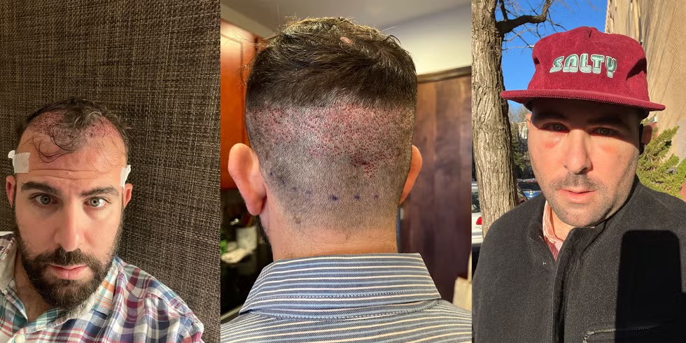 O processo de recuperação foi tranquilo. Nas primeiras noites, tive que cobrir meus travesseiros com revestimento de papel porque os locais de onde os folículos foram retirados sangravam enquanto eu dormia. Tive um inchaço facial sobre o qual fui avisado, uma resposta corporal comum a um procedimento dessa magnitude. Ao tomar banho nas primeiras semanas, tive que evitar que o jato de água atingisse diretamente meu cabelo recém-implantado e, em vez disso, usei um copo cheio de água para lavar suavemente a área. Houve pouca dor. Assim que o inchaço diminuiu e o sangramento parou após um ou dois dias, foi apenas um jogo de espera.