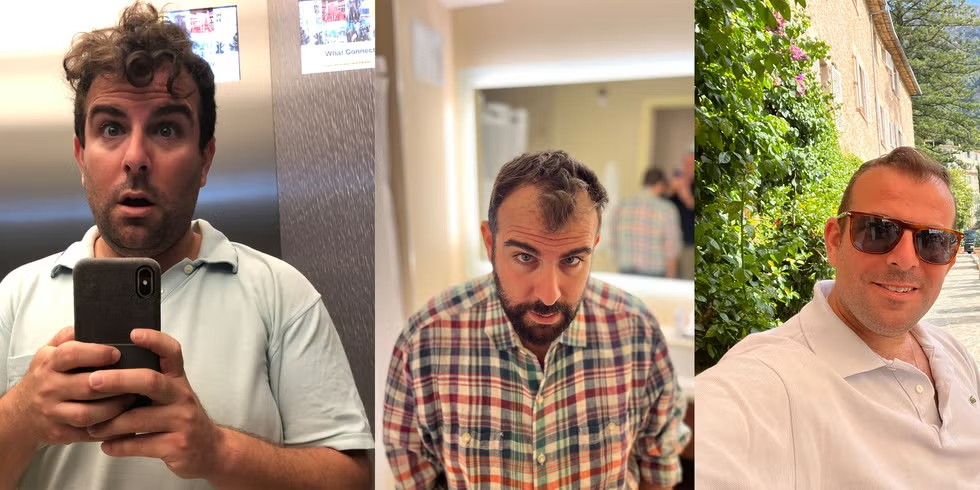 À medida que a área enxertada começou a mostrar crescimento, alguns folículos caíram. Isso é normal. Nem todo enxerto irá pegar, mas a maioria irá. A espera continuou. Por volta da marca de quatro meses, comecei a ver uma diferença real. Desde então, cada comparação de antes e depois que vejo me devolve um pouco mais de confiança. Nove meses após a cirurgia, não temo mais o vento nas minhas antigas áreas calvas. Vejo crescimento suficiente para que, quando acordo de manhã com o cabelo desgrenhado, não escove agressivamente o cabelo para esconder meu couro cabeludo antes de sair de casa. É verdade que tenho esse medo irracional de que, se eu passar os dedos pelo cabelo ou fizer qualquer coisa para perturbá-lo, todos os novos fios cairão — mas isso é algo para o meu terapeuta me ajudar a resolver.