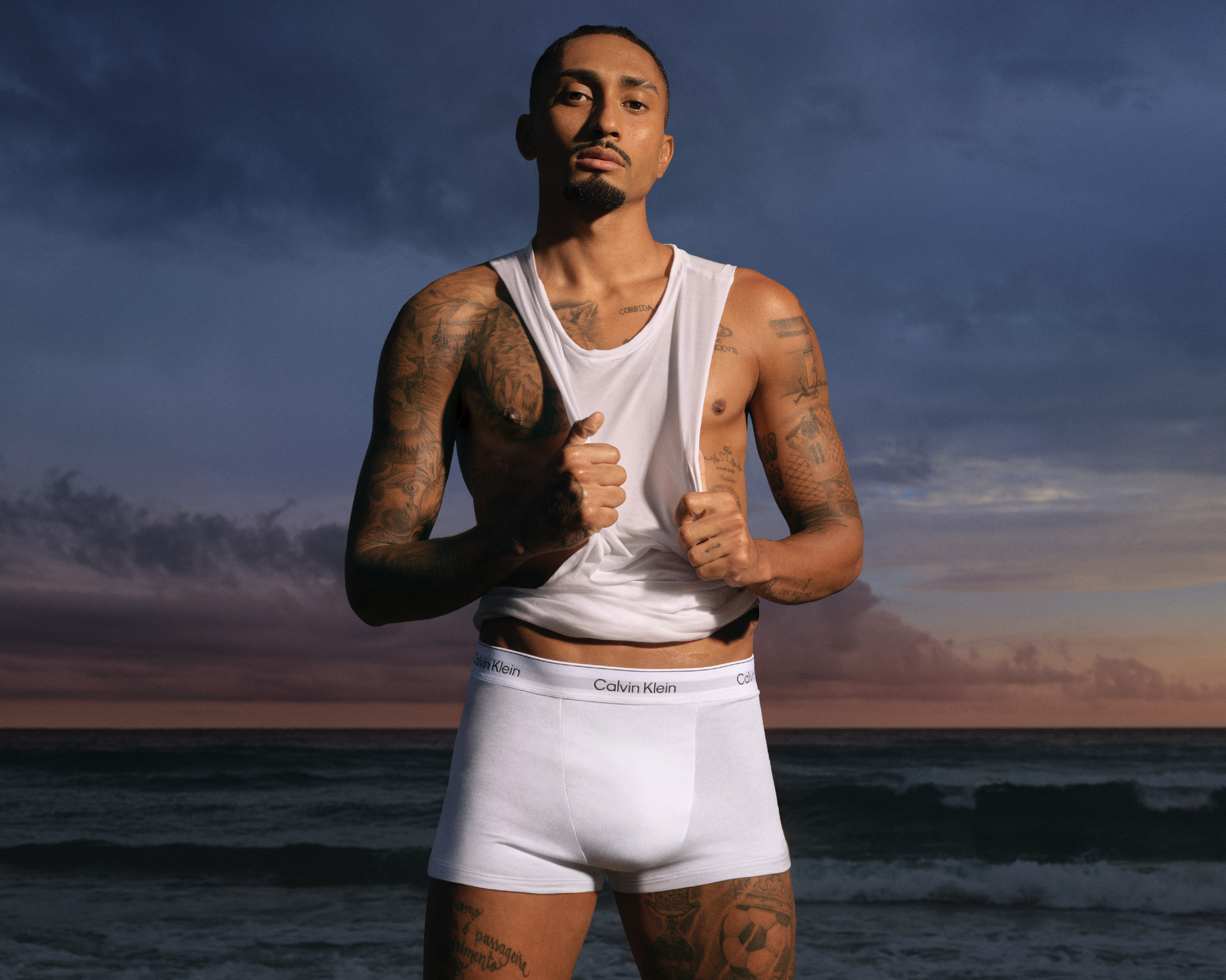 Protagonista do Barcelona, Raphinha é também uma das grandes esperanças da nossa seleção brasileira na busca pelo hexa na Copa do Mundo que se aproxima. Fora das quatro linhas, o jogador se arriscou em outra profissão recentemente: a de modelo. O craque é o rosto da nova campanha de underwear da Calvin Klein. “Gostei da experiência e procurarei novas oportunidades”, diz ele sobre a ocasião.