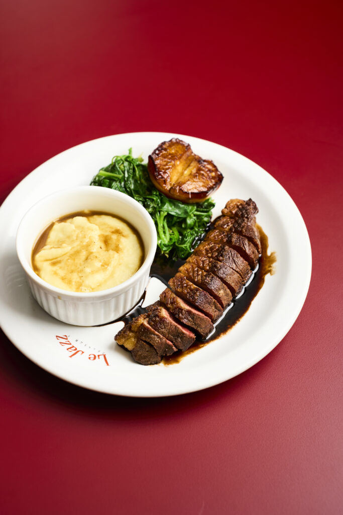 Além das novas receitas, alguns pratos clássicos do cardápio também foram aprimorados com novos acompanhamentos e apresentações. É o caso do Cachorro-Quente (R$53), agora montado no pão de leite da Le Jazz Boulangerie. A salsicha Frankfurt gratinada com gruyère vem acompanhada de picles de pepino e mostarda Dijon temperada, em vez do chucrute. Para completar, batatas fritas e salada verde. Outro destaque é o queridinho L’Entrecôte (R$123), que chega à mesa em versão mais generosa: um steak de cerca de 250g grelhado, servido com o clássico molho secreto da casa ou béarnaise, acompanhado de fritas crocantes e salada verde.