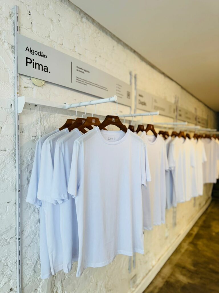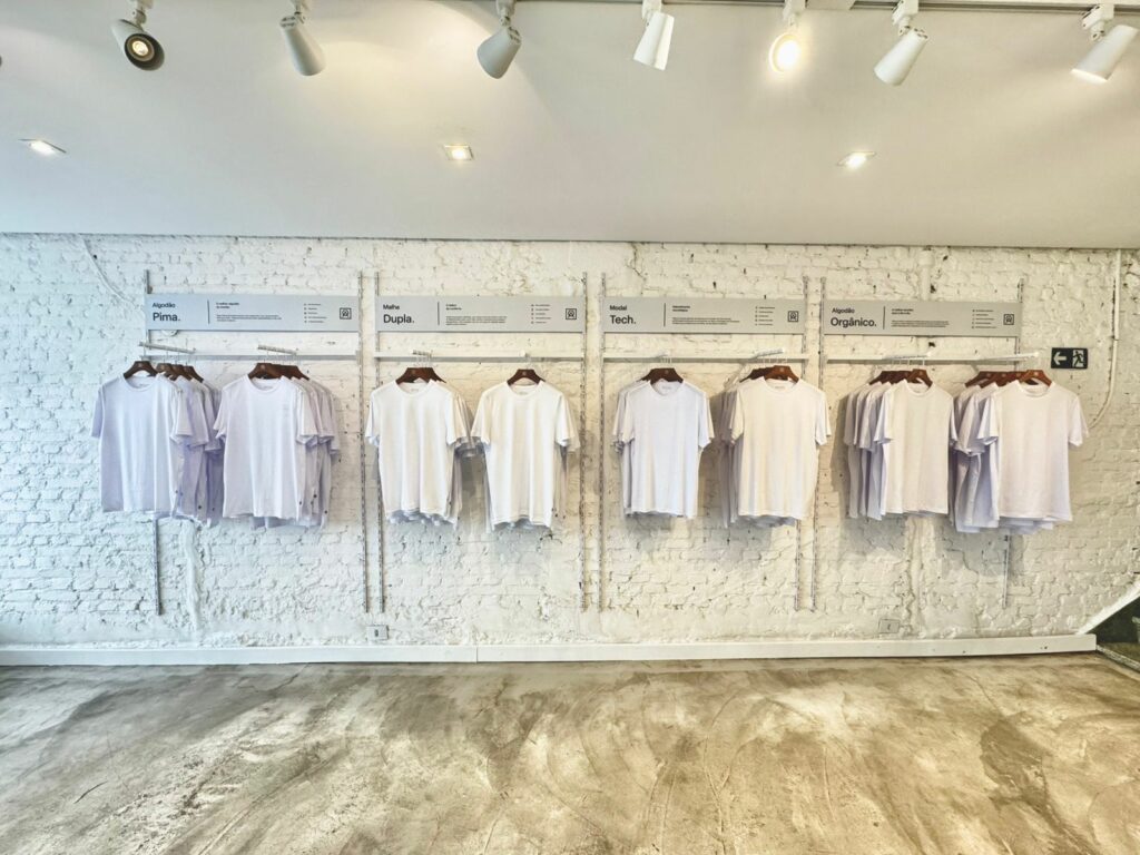 Branca do chão ao teto, a loja assume o papel de vitrine conceitual para uma ideia simples e potente: você não precisa de muitas camisetas, só precisa das certas. Quatro versões, cada uma pensada para momentos e necessidades diferentes: o Algodão Orgânico para o dia a dia, a Malha Dupla Algodão Egípcio que equilibra o casual e o alinhado, a TECH que acompanha o corpo em movimento e o Algodão Pima para ocasiões que pedem elegância com leveza.