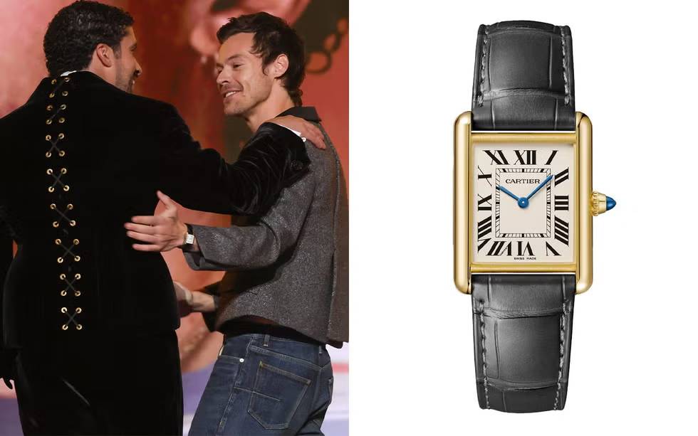 No momento, seu favorito é um Cartier Tank — um relógio histórico com uma longa lista de fãs icônicos: Andy Warhol, Muhammad Ali, Yves Saint Laurent. E isso antes de chegarmos aos especialistas modernos em moda masculina, como Timothée Chalamet, Jacob Elordi e Paul Mescal (parece que todos os “namoradinhos da internet” aderiram ao modelo).