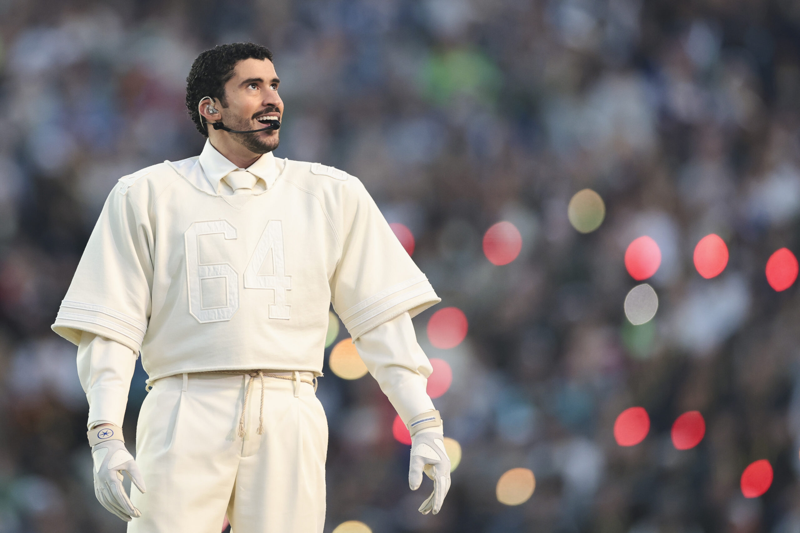 Bad Bunny foi a atração principal do show do intervalo do Super Bowl LX no último domingo (8). Para a ocasião, o músico porto-riquenho optou por looks da Zara, tênis da Adidas e relógio da Audemars Piguet, entre outros acessórios. Confira.